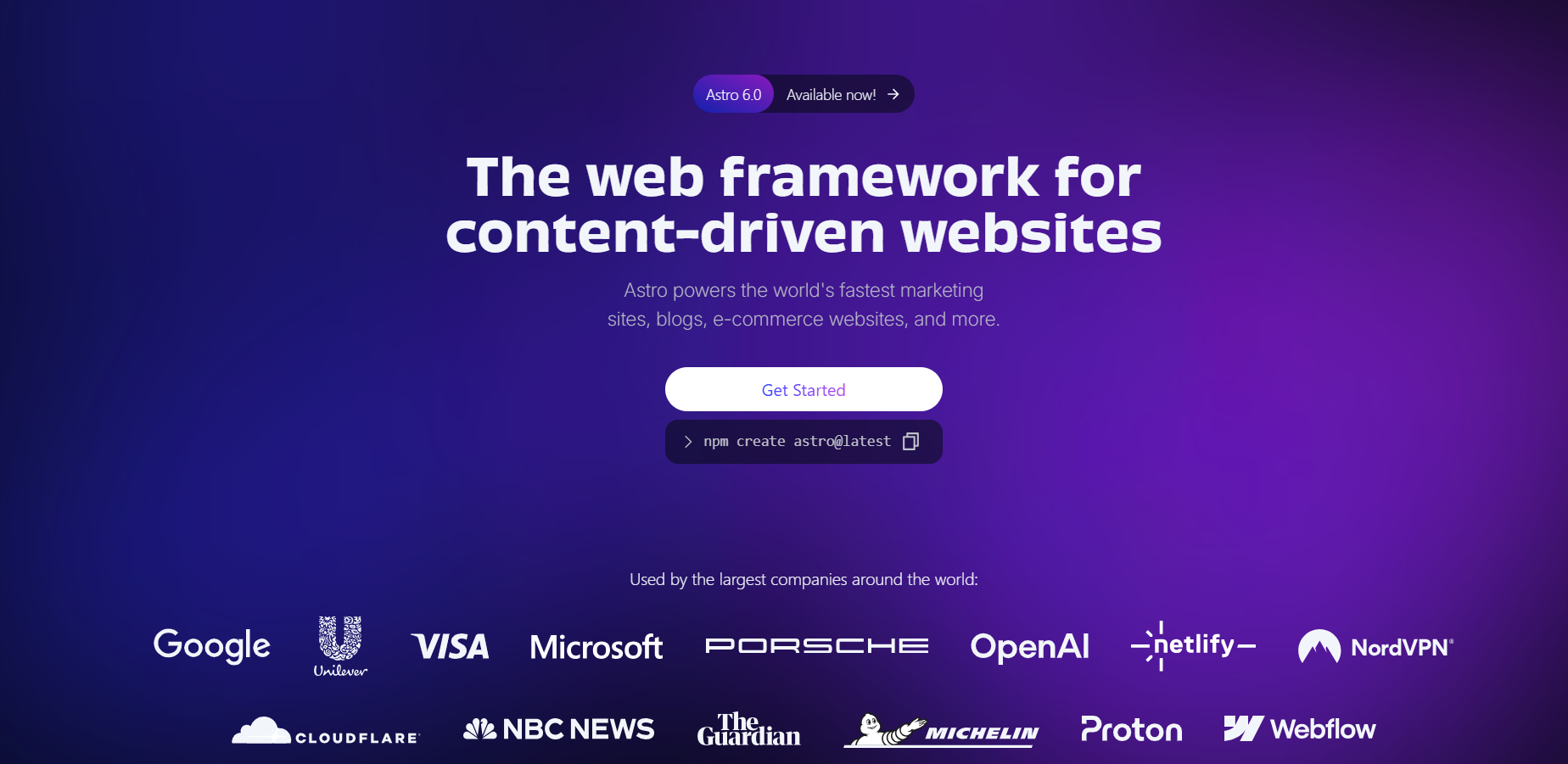 Astro is a fast-growing static site builder focused on performance. It delivers minimal JavaScript by default, resulting in faster load times and better user experience. Astro is perfect for content-driven websites and businesses looking to improve Core Web Vitals.